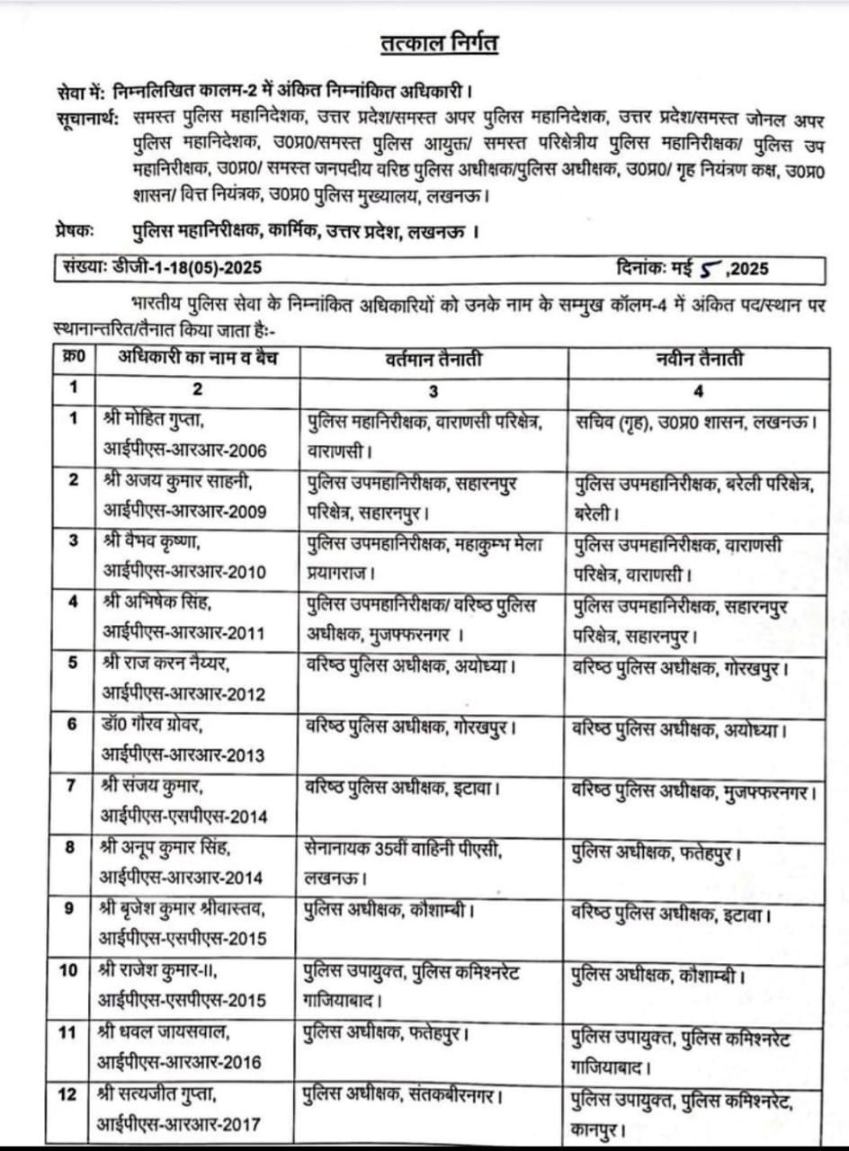 LP Live, Lucknow/ Muzaffarnagar: उत्तर प्रदेश में 14 IPS अफसरों के तबादले हो गए हैं। इस सूची में मुजफ्फरनगर में रहते हुए DiG पद पर प्रमोशन पाने वाले अभिषेक सिंह को भी शामिल किया गया। अभिषेक सिंह को सहारनपुर मंडल में DIG की जिम्मेदारी मिली है । वंही मुजफ्फरनगर में नए SSP संजय कुमार को बनाया गया है। वह इटावा जिले के SSP पद से ट्रांसफर होकर मुजफ्फरनगर में जॉइन करेंगे। संजय कुमार मूल रूप से आजमगढ़ जिले के निवासी है, जिसके चलते वह यूपी के जिलों का मिजाज अच्छे से समझते है।
