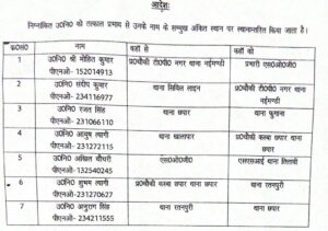LP Live, Muzaffarnagar: मुजफ्फरनगर SSP संजय कुमार वर्मा ने रविवार देर रात उप निरीक्षकों की तबादला सूची जारी की है इसमें ख़ास बात यह है कि छपार थानाध्यक्षगजेंद्र सिंह को लाइन हाजिर किया गया है। उनकी जगह तितावी थाने SSI मोहित कुमार को छपार थाने की कमान सौंपी गई है। इसके अलावा अन्य उप निरीक्षकों के भी थाने बदले गए हैं।