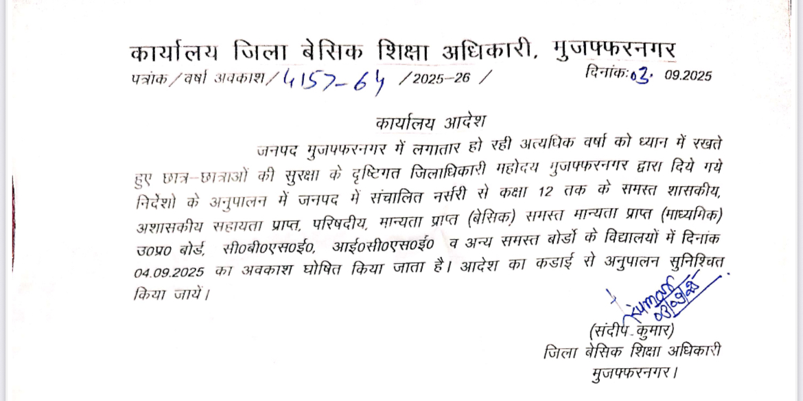 LP Live, Muzaffarnagar: अत्यधिक वर्षा के चलते मुजफ्फरनगर के स्कूलों में गुरुवार को भी अवकाश रहेगा। डीएम उमेश कुमार मिश्रा के निर्देश पर बीएसए संदीप कुमार ने आदेश जारी कर दिया है। गुरुवार को चार सिंतबर को भी बरसात के चलते जिले में 12वीं तक के स्कूल बंद रहेंगे। बीएसए संदीप कुमार ने बताया कि मुजफ्फरनगर में सभी बोर्ड के 12वीं तक के विद्यालयों में बरसात के चलते अवकाश किया गया है। यह अवकाश बच्चों की सुरक्षा को ध्यान में रखते हुए किया गया है। स्कूलों में अवकाश का लगातार तीसरा दिन रहेगा।