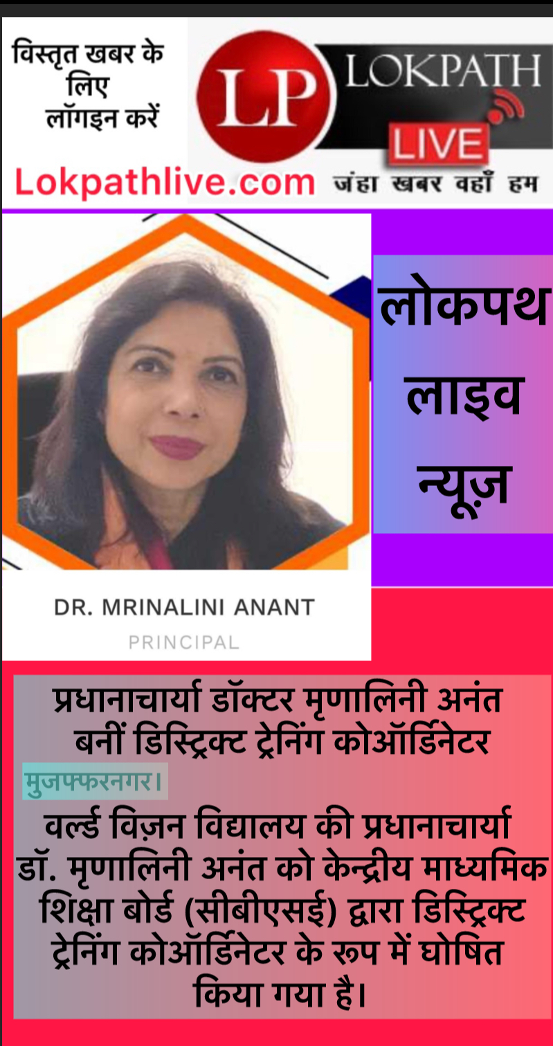 LP Live, Muzaffarnagar: डिस्ट्रिक्ट लेवल पर एमजी वर्ल्ड विज़न विद्यालय की प्रधानाचार्या डॉक्टर मृणालिनी अनंत को CBSE ने डिस्ट्रिक्ट ट्रेनिंग कोऑर्डिनेटर बनाया है। वह कई वर्षों से सीबीएसई में रिसोर्स पर्सन और मास्टर ट्रेनर के रूप में कार्यरत हैं। उनकी उपलब्धियों व सराहनीय कार्य को देखते हुए बोर्ड द्वारा उनको यह सम्मान दिया गया।