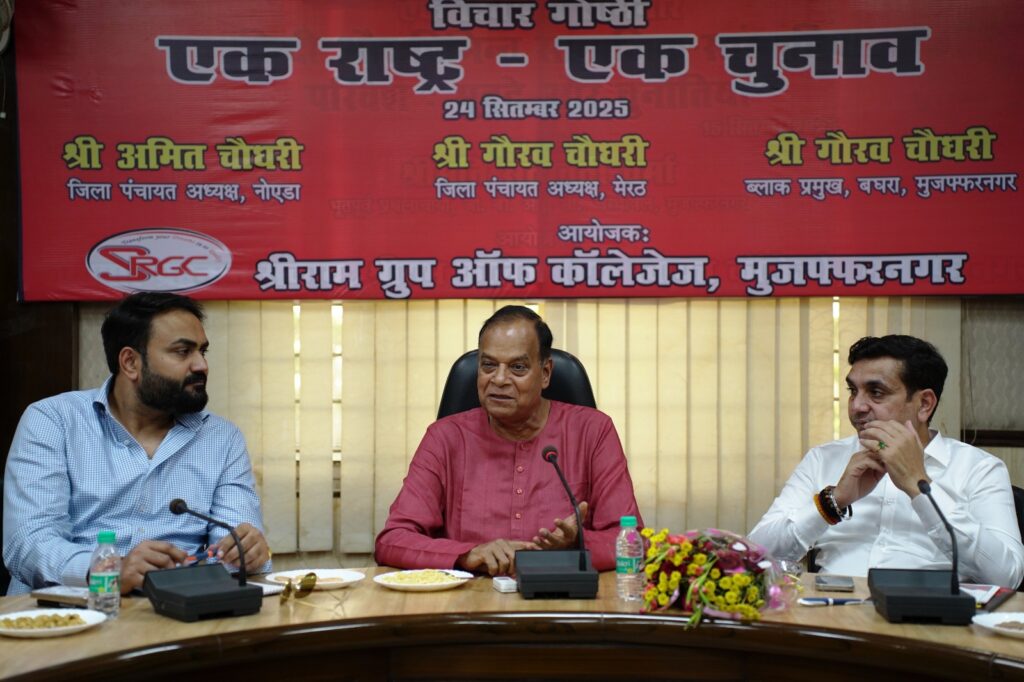 LP Live, Muzaffarnafar: श्रीराम ग्रुप ऑफ कॉलेज में गुरुवार को एक राष्ट्र एक चुनाव विषय पर विचार गोष्ठी हुई। कार्यक्रम की अध्यक्षता कालेज चेयरमैन डा. एससी कुलश्रेष्ठ ने की। इस अवसर पर मुख्य अतिथि के रूप में जिला पंचायत अध्यक्ष नोएडा अमित चौधरी और जिला पंचायत अध्यक्ष मेरठ गौरव चौधरी आदि ने अपने विचार रखे। विशेष रूप से उपस्थित रहे।