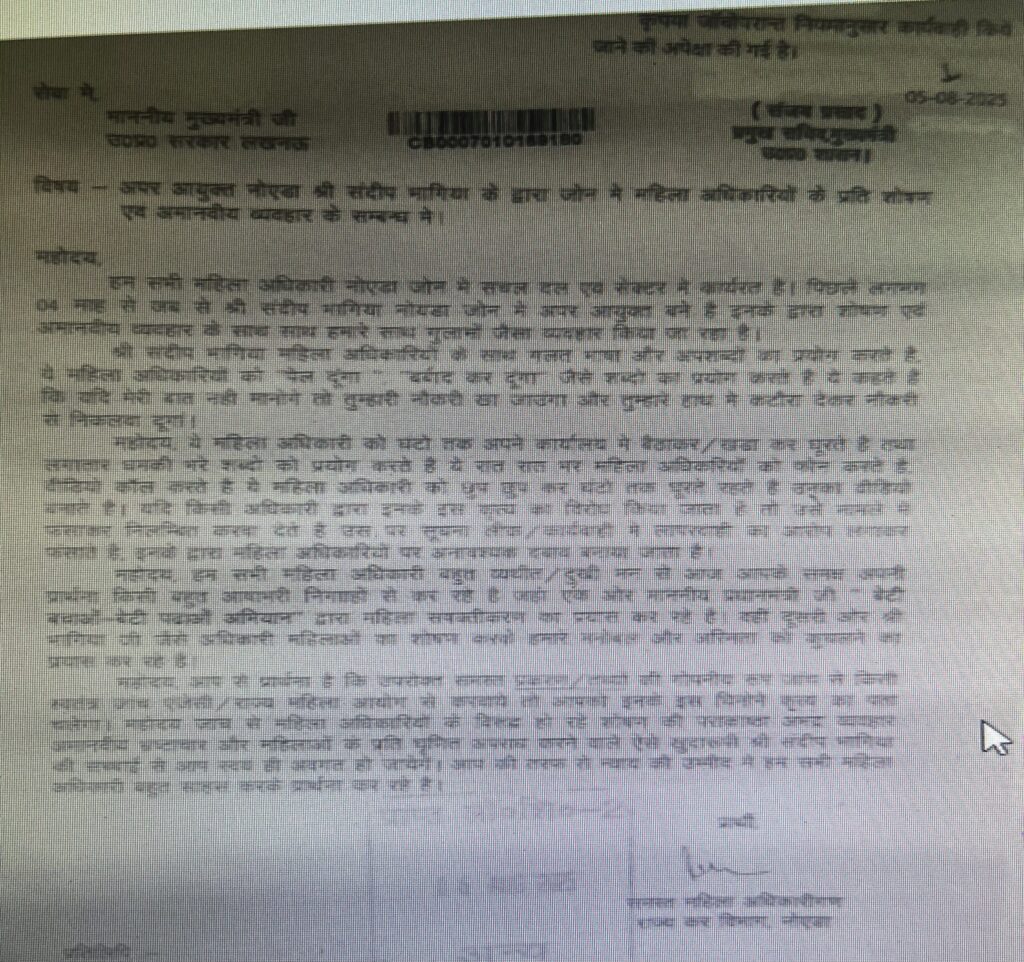 उत्तर प्रदेश राज्य कर विभाग के नोएडा कार्यायल में अपर आयुक्त के पद पर तैनात आईएएस अधिकारी संदीप भागिया पर महिला अधिकारियों ने आरोप लगाए हैं। उत्तर प्रदेश के मुख्यमंत्री सीएम योगी आदित्यनाथ से की गई लिखित शिकायत में महिला अधिकारियों ने लिखा है, “हम सभी महिला अधिकारी नोएडा जोन मे सचल दल एवं सेक्टर में कार्यरत हैं। पिछले लगभग चार महीने से संदीप भागिया नोएडा जोन में अपर आयुक्त बने हैं। इनके द्वारा शोषण एवं अमानवीय व्यवहार के साथ साथ हमारे साथ गुलामों जैसा व्यवहार किया जा रहा है। इस पत्र में पांच अगस्त की तारीख अंकित है। यह पत्र राज्यपाल, यूपी राज्य महिला आयोग, मुख्य सचिव, अपर मुख्य सचिव मुख्यमंत्री कार्यालय, अपर मुख्य सचिव राज्य कर विभाग एवं राज्य कर लखनऊ के कमिश्नर को भेजी गई है। पत्र में यह भी लिखा है कि वह गलत भाषा और अपशब्दों का प्रयोग करते हैं। महिला अधिकारी को घंटों अपने कार्यालय में बैठाकर, खड़ा कर घूरते हैं तथा लगातार धमकी भरे शब्दों को प्रयोग करते हैं। ये रात को महिला अधिकरियों को फोन करते हैं। वीडियो कॉल करते हैं। ये महिला अधिकारी को छुप-छुपकर घंटों तक घूरते रहते हैं। उनपर वीडिया बनाने का भी अरोप लगाय है। यदि किसी अधिकारी द्वारा इनके इस कृत्य का विरोध किया जाता है तो उसे मामले में फंसाकर निलम्बित करवा देते हैं। विरोध करने वाले को सूचना लीक, कार्यवाही में लापरवाही का आरोप लगाकर फंसाते हैं। इनके द्वारा महिला अधिकारियों पर अनावश्यक दबाव बनाया जाता है। इस पत्र ने विभाग के साथ अफसरों में हलचल मचा दी है। संदीप भागिया लंबे समय तक मुजफ्फरनगर में सीडीओ के पद पर तैनात रहे हैं। मुजफ्फरनग से ही वह नोएडी जीएसटी कार्यालय मे अपर आयुक्त के पद पर तैनात हुए थे।