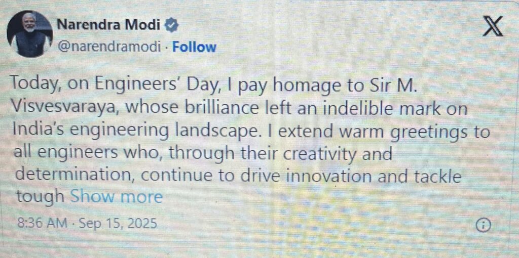 LP Live, New Delhi: भारत के प्रधानमंत्री नरेन्द्र मोदी ने इंजीनियर्स दिवस के अवसर पर भारत रत्न सर एम. विश्वेश्वरैया को भावभीनी श्रद्धांजलि अर्पित की, जिनके अग्रणी योगदानों ने भारत के आधुनिक इंजीनियरिंग की नींव रखी।