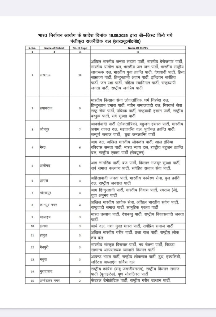 LP Live, Lucknow: भारत निर्वाचन आयोग ने शुक्रवार को उत्तर प्रदेश के 121 दलों को पंजीकृत राजनीतिक दलों की सूची से बाहर कर दिया है। यह दल 51 जिलों में पंजीकृत हैं। इसमें गाजियाबाद, मुजफ्फरनगर सहित 51 जिलों से 121 दल शामिल है। इनको राजनीतिक दलों की सूची से बाहर करने की वजह पिछले कई वर्षों में कोई लोकसभा या विधानसभा का चुनाव नहीं लड़ना रहा है। मुजफ्फरनगर से केवल एक दल समाज सेवा पार्टी को बाहर किया गया है। गाजियाबाद की बहुजन सेना और भारतीय कोटिल्य सेना शामिल है।