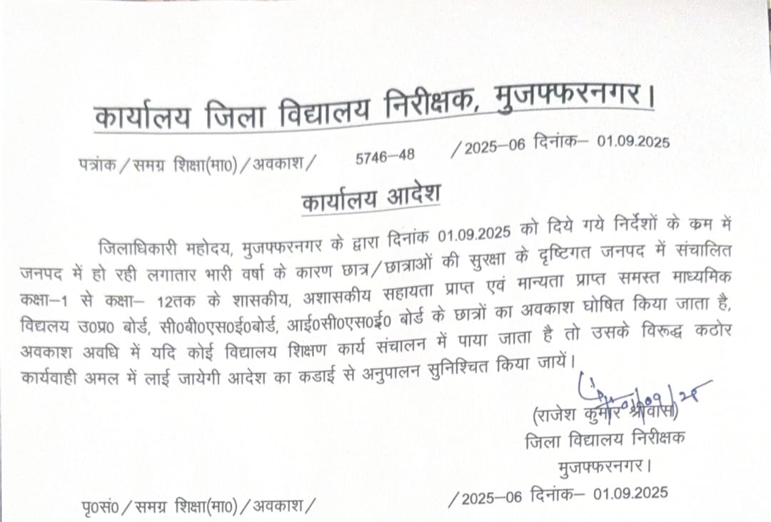 मुजफ्फरनगर डीएम उमेश मिश्रा ने दो सितंबर 2025 को बारहवीं कक्षा तक की छुट्टी के आदेश दिए, लेकिन Dios विभाग का आधिकारिक लेटर जारी नहीं होने पर ज्यादातर स्कूल केवल आठवीं तक ही अवकाश मानकर चल रहे थे। रात दस बजे डीएम ने dios का लैटर जारी कराया और एक्स अकाउंट पर भी बारहवीं कक्षा तक छुट्टी के आदेश अपडेट कराए। अवकाश अवधी में स्कूल संचालन मिलने पर कारवाई के आदेश है।