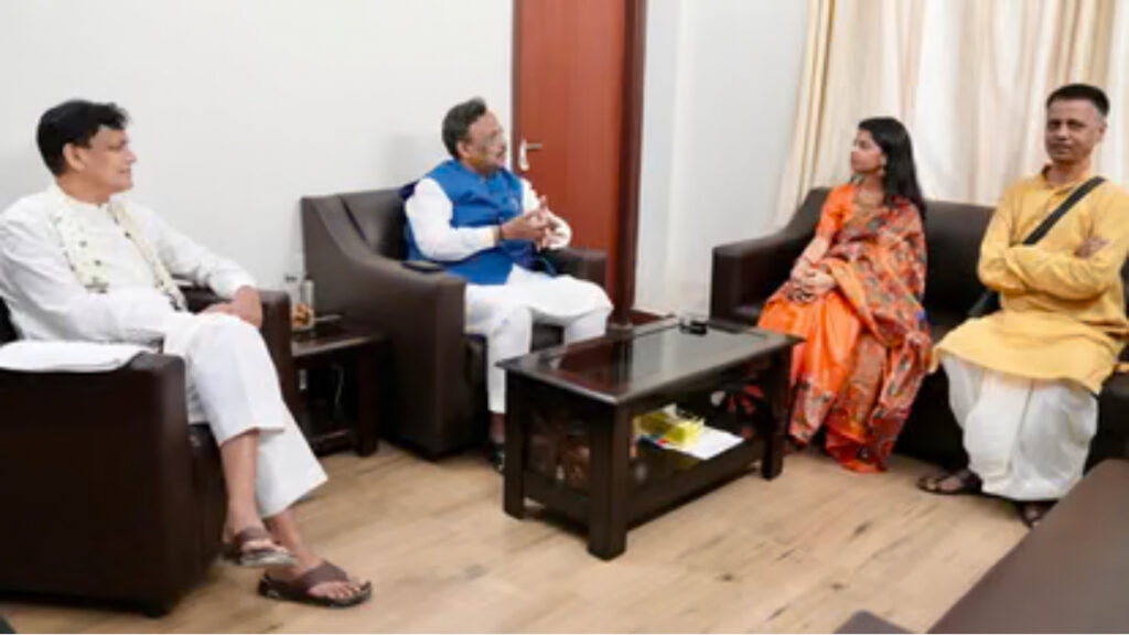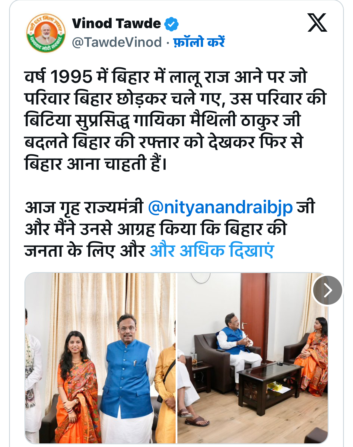 बीजेपी नेता विनोद तावड़े ने हाल ही में अपने सोशल मीडिया प्लेटफॉर्म ‘X’ पर कुछ तस्वीरें साझा करते हुए लिखा कि “1995 में लालू राज के दौरान बिहार छोड़ने वाले एक परिवार की बिटिया, सुप्रसिद्ध गायिका मैथिली ठाकुर जी, अब बदलते बिहार को देखकर फिर से राज्य में लौटना चाहती हैं। आज नित्यानंद राय जी और मैंने उनसे आग्रह किया कि वे बिहार के सामान्य आदमी की अपेक्षाओं को पूरा करें। बिहार की बिटिया को अनंत शुभकामनाएं