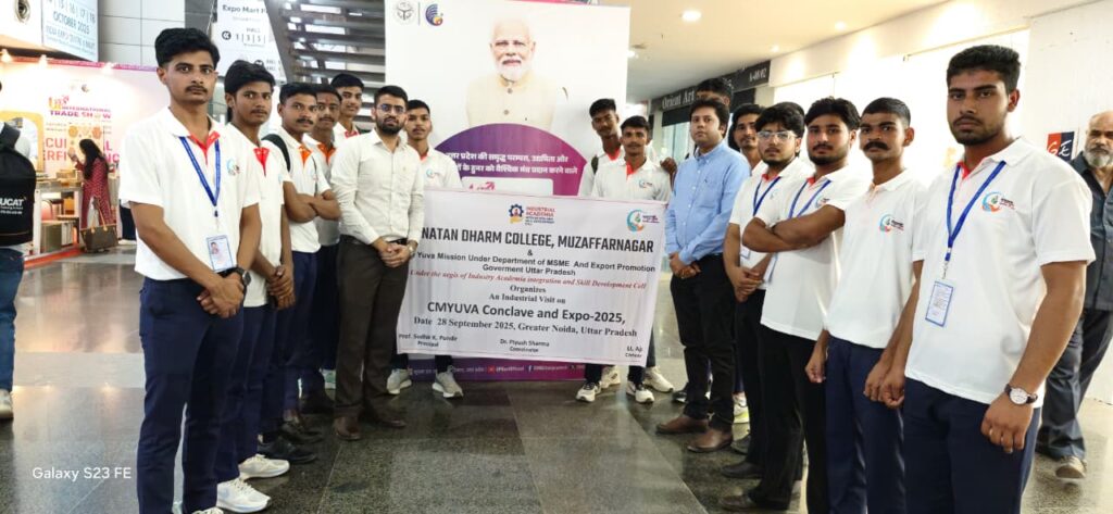 मुख्यमंत्री युवा उद्यमी विकास अभियान के अंतर्गत सनातन धर्म महाविद्यालय मुजफ्फरनगर और उत्तर प्रदेश सरकार के सूक्ष्म, लघु एवं मध्यम उद्योग व निर्यात प्रोत्साहन विभाग के बीच अनुबंध का लाभ छात्र-छात्राओं का मिला। कालेज प्राचार्य प्रो. सुधीर कुमार पुंडीर के मार्गदर्शन में कालेज के छात्र-छात्राएं ग्रेटर नोएडा में चल रहे सीएम युवा सम्मेलन एवं प्रदर्शनी 2025 में सम्मिलित हुए। कार्यक्रम का संचालन इंडस्ट्रियल एकेडेमिया इंटीग्रेशन एंड स्किल डेवलपमेंट सेल के प्रभारी डा. पीयूष शर्मा व सहसंचालन लेफ्टिनेंट अजय (सीटीओ एनसीसी) ने किया। कार्यक्रम में उद्योग विभाग से कामरान भी उपस्थित रहे। कालेज प्राचार्य प्रो. सुधीर पुंडीर ने बताया कि कार्यक्रम में भाग लेने से विद्यार्थियों को नवीन व्यावसायिक तकनीकों की जानकारी मिली। नए स्टार्टअप अवसरों की समझ तथा उद्योग एवं बाज़ार से सीधे जुड़ने का अनुभव प्राप्त हुआ।