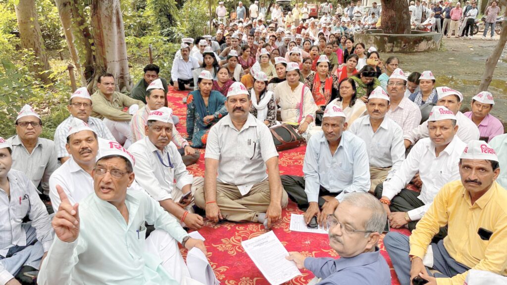 LP Live, Muzaffarnagar: माध्यमिक शिक्षक संघ ठकुराई गुट के बैनर तले शिक्षकों ने धरना दिया।