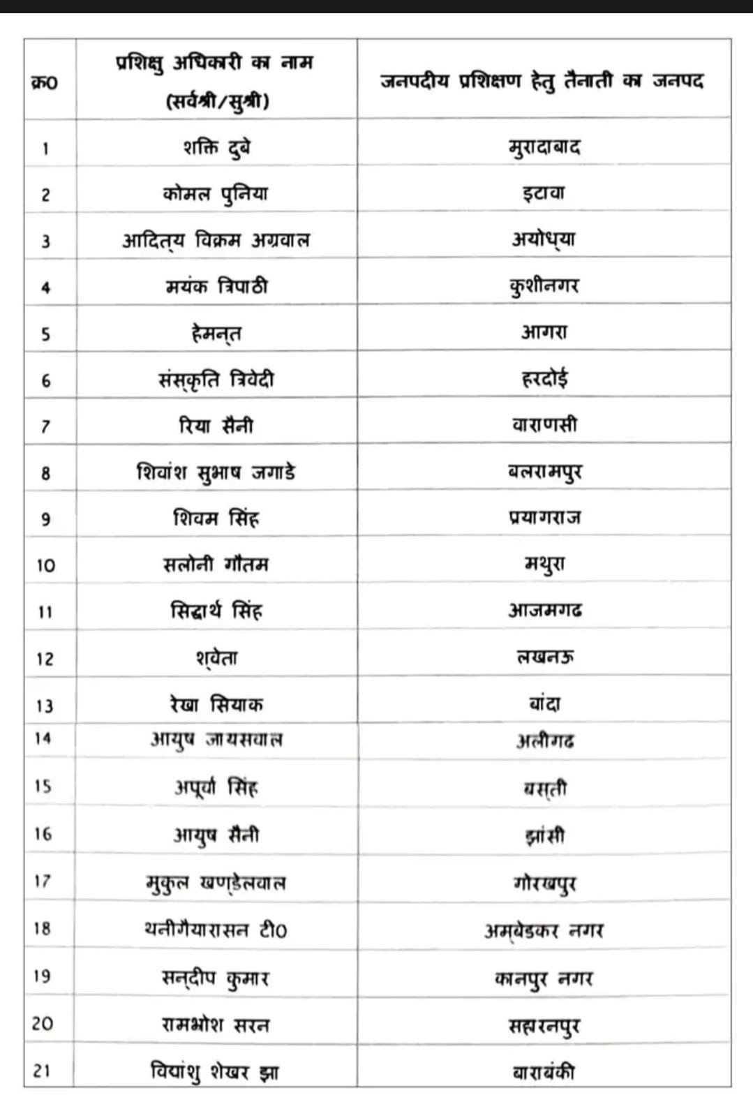 लोकपथ लाइव, लखनऊ। उत्तर प्रदेश सरकार ने प्रशासनिक ढांचे को मजबूती देने की दिशा में कदम बढ़ाते हुए 2025 बैच के 21 प्रशिक्षु (ट्रेनी) आईएएस अधिकारियों की जिलों में तैनाती की घोषणा की है। ये सभी अधिकारी मसूरी स्थित लाल बहादुर शास्त्री राष्ट्रीय प्रशासन अकादमी (LBSNAA) में अपना शुरुआती प्रशिक्षण सफलतापूर्वक पूरा कर चुके हैं और अब फील्ड अनुभव के लिए उत्तर प्रदेश के विभिन्न जनपदों में भेजे जा रहे हैं।